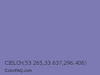 CIELCh 53.265,33.637,296.406 Color is a normal indigo color and the nearest color is Wild Blue Yonder #7a89b8. Hex code #7d79b3 and RGB value is rgb(125,121,179). In RGB color space, this color is composed of 49% red, 47% green, 70% blue, In CMYK color space, this color is composed of 30% cyan, 32% magenta, 0% yellow , 30% black , In HSL color space, this color has a hue angle of 244° , 28% saturation and 59% lightness.