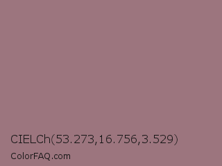 CIELCh 53.273,16.756,3.529 Color is a normal red color and the nearest color is Bazaar #98777b. Hex code #9c757e and RGB value is rgb(156,117,126). In RGB color space, this color is composed of 61% red, 46% green, 49% blue, In CMYK color space, this color is composed of 0% cyan, 25% magenta, 19% yellow , 39% black , In HSL color space, this color has a hue angle of 346° , 16% saturation and 54% lightness.