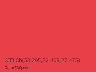 CIELCh 53.295,72.408,27.475 Color is a normal red color and the nearest color is Desire #ea3c53. Hex code #e8404a and RGB value is rgb(232,64,74). In RGB color space, this color is composed of 91% red, 25% green, 29% blue, In CMYK color space, this color is composed of 0% cyan, 72% magenta, 68% yellow , 9% black , In HSL color space, this color has a hue angle of 356° , 79% saturation and 58% lightness.