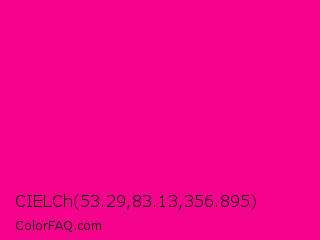 CIELCh 53.29,83.13,356.895 Color is a normal magenta color and the nearest color is Magenta Process #ff0090. Hex code #f5038a and RGB value is rgb(245,3,138). In RGB color space, this color is composed of 96% red, 1% green, 54% blue, In CMYK color space, this color is composed of 0% cyan, 99% magenta, 44% yellow , 4% black , In HSL color space, this color has a hue angle of 327° , 98% saturation and 49% lightness.