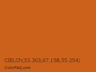 CIELCh 53.303,67.158,55.254 Color is a normal orange color and the nearest color is Piper #c96323. Hex code #cb611b and RGB value is rgb(203,97,27). In RGB color space, this color is composed of 80% red, 38% green, 11% blue, In CMYK color space, this color is composed of 0% cyan, 52% magenta, 87% yellow , 20% black , In HSL color space, this color has a hue angle of 24° , 77% saturation and 45% lightness.