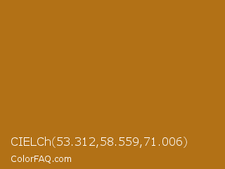 CIELCh 53.312,58.559,71.006 Color is a normal orange color and the nearest color is Mandalay #ad781b. Hex code #b27116 and RGB value is rgb(178,113,22). In RGB color space, this color is composed of 70% red, 44% green, 9% blue, In CMYK color space, this color is composed of 0% cyan, 37% magenta, 88% yellow , 30% black , In HSL color space, this color has a hue angle of 35° , 78% saturation and 39% lightness.