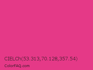 CIELCh 53.313,70.128,357.54 Color is a normal rose color and the nearest color is Cerise Pink #ec3b83. Hex code #e53987 and RGB value is rgb(229,57,135). In RGB color space, this color is composed of 90% red, 22% green, 53% blue, In CMYK color space, this color is composed of 0% cyan, 75% magenta, 41% yellow , 10% black , In HSL color space, this color has a hue angle of 333° , 77% saturation and 56% lightness.