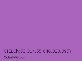 CIELCh 53.314,55.646,320.395 Color is a normal purple color and the nearest color is Rich Lavender #a76bcf. Hex code #aa64bd and RGB value is rgb(170,100,189). In RGB color space, this color is composed of 67% red, 39% green, 74% blue, In CMYK color space, this color is composed of 10% cyan, 47% magenta, 0% yellow , 26% black , In HSL color space, this color has a hue angle of 287° , 40% saturation and 57% lightness.