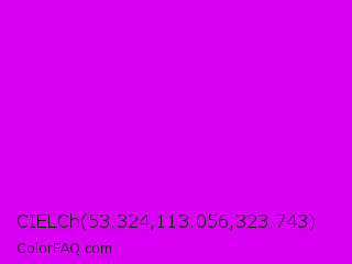 CIELCh 53.324,113.056,323.743 Color is a normal magenta color and the nearest color is Phlox #df00ff. Hex code #d900f5 and RGB value is rgb(217,0,245). In RGB color space, this color is composed of 85% red, 0% green, 96% blue, In CMYK color space, this color is composed of 11% cyan, 100% magenta, 0% yellow , 4% black , In HSL color space, this color has a hue angle of 293° , 100% saturation and 48% lightness.