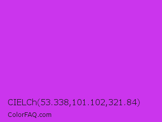 CIELCh 53.338,101.102,321.84 Color is a normal purple color and the nearest color is Steel Pink #cc33cc. Hex code #cb35ed and RGB value is rgb(203,53,237). In RGB color space, this color is composed of 80% red, 21% green, 93% blue, In CMYK color space, this color is composed of 14% cyan, 78% magenta, 0% yellow , 7% black , In HSL color space, this color has a hue angle of 289° , 84% saturation and 57% lightness.