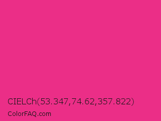 CIELCh 53.347,74.62,357.822 Color is a normal rose color and the nearest color is Cerise Pink #ec3b83. Hex code #eb2e87 and RGB value is rgb(235,46,135). In RGB color space, this color is composed of 92% red, 18% green, 53% blue, In CMYK color space, this color is composed of 0% cyan, 80% magenta, 43% yellow , 8% black , In HSL color space, this color has a hue angle of 332° , 83% saturation and 55% lightness.