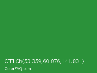 CIELCh 53.359,60.876,141.831 Color is a normal green color and the nearest color is Forest Green #228b22. Hex code #2b923a and RGB value is rgb(43,146,58). In RGB color space, this color is composed of 17% red, 57% green, 23% blue, In CMYK color space, this color is composed of 71% cyan, 0% magenta, 60% yellow , 43% black , In HSL color space, this color has a hue angle of 129° , 54% saturation and 37% lightness.
