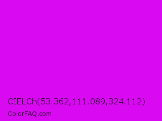 CIELCh 53.362,111.089,324.112 Color is a normal magenta color and the nearest color is Phlox #df00ff. Hex code #d90af2 and RGB value is rgb(217,10,242). In RGB color space, this color is composed of 85% red, 4% green, 95% blue, In CMYK color space, this color is composed of 10% cyan, 96% magenta, 0% yellow , 5% black , In HSL color space, this color has a hue angle of 294° , 92% saturation and 49% lightness.