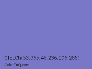CIELCh 53.365,46.236,296.285 Color is a light indigo color and the nearest color is Moody Blue #7f76d3. Hex code #7977c7 and RGB value is rgb(121,119,199). In RGB color space, this color is composed of 47% red, 47% green, 78% blue, In CMYK color space, this color is composed of 39% cyan, 40% magenta, 0% yellow , 22% black , In HSL color space, this color has a hue angle of 242° , 42% saturation and 62% lightness.