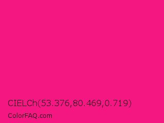 CIELCh 53.376,80.469,0.719 Color is a normal rose color and the nearest color is Fluorescent Pink #ff1493. Hex code #f41681 and RGB value is rgb(244,22,129). In RGB color space, this color is composed of 96% red, 9% green, 51% blue, In CMYK color space, this color is composed of 0% cyan, 91% magenta, 47% yellow , 4% black , In HSL color space, this color has a hue angle of 331° , 91% saturation and 52% lightness.