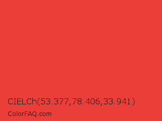 CIELCh 53.377,78.406,33.941 Color is a normal red color and the nearest color is Cinnabar #e34234. Hex code #eb3e38 and RGB value is rgb(235,62,56). In RGB color space, this color is composed of 92% red, 24% green, 22% blue, In CMYK color space, this color is composed of 0% cyan, 74% magenta, 76% yellow , 8% black , In HSL color space, this color has a hue angle of 2° , 82% saturation and 57% lightness.