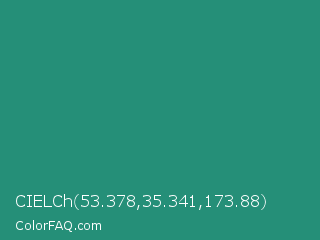 CIELCh 53.378,35.341,173.88 Color is a normal cyan color and the nearest color is Illuminating Emerald #319177. Hex code #258f78 and RGB value is rgb(37,143,120). In RGB color space, this color is composed of 15% red, 56% green, 47% blue, In CMYK color space, this color is composed of 74% cyan, 0% magenta, 16% yellow , 44% black , In HSL color space, this color has a hue angle of 167° , 59% saturation and 35% lightness.