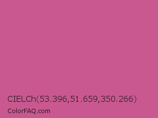 CIELCh 53.396,51.659,350.266 Color is a normal rose color and the nearest color is Mulberry #c54b8c. Hex code #c95890 and RGB value is rgb(201,88,144). In RGB color space, this color is composed of 79% red, 35% green, 56% blue, In CMYK color space, this color is composed of 0% cyan, 56% magenta, 28% yellow , 21% black , In HSL color space, this color has a hue angle of 330° , 51% saturation and 57% lightness.