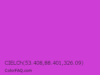 CIELCh 53.408,88.401,326.09 Color is a normal magenta color and the nearest color is Steel Pink #cc33cc. Hex code #ce3ed6 and RGB value is rgb(206,62,214). In RGB color space, this color is composed of 81% red, 24% green, 84% blue, In CMYK color space, this color is composed of 4% cyan, 71% magenta, 0% yellow , 16% black , In HSL color space, this color has a hue angle of 297° , 65% saturation and 54% lightness.