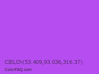 CIELCh 53.409,93.036,316.37 Color is a light purple color and the nearest color is Medium Orchid #ba55d3. Hex code #b54df0 and RGB value is rgb(181,77,240). In RGB color space, this color is composed of 71% red, 30% green, 94% blue, In CMYK color space, this color is composed of 25% cyan, 68% magenta, 0% yellow , 6% black , In HSL color space, this color has a hue angle of 278° , 84% saturation and 62% lightness.