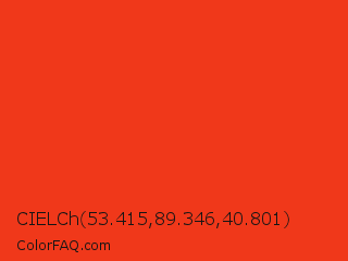 CIELCh 53.415,89.346,40.801 Color is a normal red color and the nearest color is Pomegranate #f34723. Hex code #f0381a and RGB value is rgb(240,56,26). In RGB color space, this color is composed of 94% red, 22% green, 10% blue, In CMYK color space, this color is composed of 0% cyan, 77% magenta, 89% yellow , 6% black , In HSL color space, this color has a hue angle of 8° , 88% saturation and 52% lightness.
