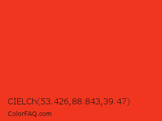 CIELCh 53.426,88.843,39.47 Color is a normal red color and the nearest color is Pomegranate #f34723. Hex code #f1361f and RGB value is rgb(241,54,31). In RGB color space, this color is composed of 95% red, 21% green, 12% blue, In CMYK color space, this color is composed of 0% cyan, 78% magenta, 87% yellow , 5% black , In HSL color space, this color has a hue angle of 7° , 88% saturation and 53% lightness.