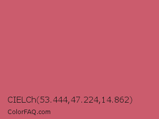 CIELCh 53.444,47.224,14.862 Color is a normal red color and the nearest color is Fuzzy Wuzzy #cc6666. Hex code #cb5c6d and RGB value is rgb(203,92,109). In RGB color space, this color is composed of 80% red, 36% green, 43% blue, In CMYK color space, this color is composed of 0% cyan, 55% magenta, 46% yellow , 20% black , In HSL color space, this color has a hue angle of 351° , 52% saturation and 58% lightness.
