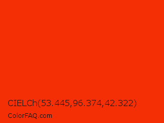 CIELCh 53.445,96.374,42.322 Color is a normal red color and the nearest color is Ferrari Red #ff2800. Hex code #f52f05 and RGB value is rgb(245,47,5). In RGB color space, this color is composed of 96% red, 18% green, 2% blue, In CMYK color space, this color is composed of 0% cyan, 81% magenta, 98% yellow , 4% black , In HSL color space, this color has a hue angle of 11° , 96% saturation and 49% lightness.