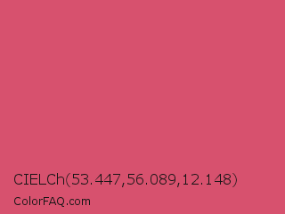 CIELCh 53.447,56.089,12.148 Color is a normal red color and the nearest color is Cabaret #d94972. Hex code #d7516e and RGB value is rgb(215,81,110). In RGB color space, this color is composed of 84% red, 32% green, 43% blue, In CMYK color space, this color is composed of 0% cyan, 62% magenta, 49% yellow , 16% black , In HSL color space, this color has a hue angle of 347° , 63% saturation and 58% lightness.