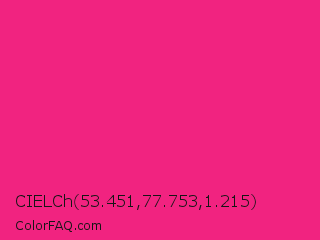 CIELCh 53.451,77.753,1.215 Color is a normal rose color and the nearest color is Barbie Pink #e0218a. Hex code #f12380 and RGB value is rgb(241,35,128). In RGB color space, this color is composed of 95% red, 14% green, 50% blue, In CMYK color space, this color is composed of 0% cyan, 85% magenta, 47% yellow , 5% black , In HSL color space, this color has a hue angle of 333° , 88% saturation and 54% lightness.