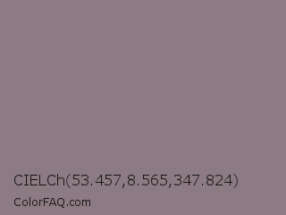 CIELCh 53.457,8.565,347.824 Color is a normal rose color and the nearest color is Rocket Metallic #8a7f80. Hex code #8d7b83 and RGB value is rgb(141,123,131). In RGB color space, this color is composed of 55% red, 48% green, 51% blue, In CMYK color space, this color is composed of 0% cyan, 13% magenta, 7% yellow , 45% black , In HSL color space, this color has a hue angle of 333° , 7% saturation and 52% lightness.