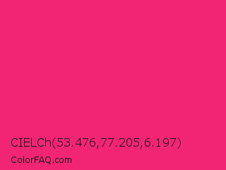 CIELCh 53.476,77.205,6.197 Color is a normal rose color and the nearest color is Razzmatazz #e3256b. Hex code #f22575 and RGB value is rgb(242,37,117). In RGB color space, this color is composed of 95% red, 15% green, 46% blue, In CMYK color space, this color is composed of 0% cyan, 85% magenta, 52% yellow , 5% black , In HSL color space, this color has a hue angle of 337° , 89% saturation and 55% lightness.