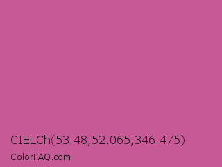CIELCh 53.48,52.065,346.475 Color is a normal magenta color and the nearest color is Mulberry #c54b8c. Hex code #c75996 and RGB value is rgb(199,89,150). In RGB color space, this color is composed of 78% red, 35% green, 59% blue, In CMYK color space, this color is composed of 0% cyan, 55% magenta, 25% yellow , 22% black , In HSL color space, this color has a hue angle of 327° , 50% saturation and 56% lightness.