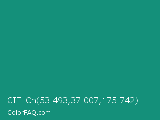 CIELCh 53.493,37.007,175.742 Color is a normal cyan color and the nearest color is Gossamer #069b81. Hex code #14907a and RGB value is rgb(20,144,122). In RGB color space, this color is composed of 8% red, 56% green, 48% blue, In CMYK color space, this color is composed of 86% cyan, 0% magenta, 15% yellow , 44% black , In HSL color space, this color has a hue angle of 169° , 76% saturation and 32% lightness.