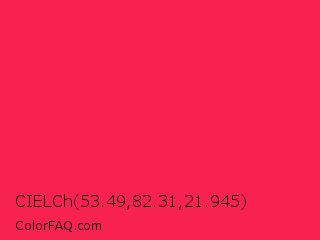 CIELCh 53.49,82.31,21.945 Color is a normal red color and the nearest color is Awesome #ff2052. Hex code #f72250 and RGB value is rgb(247,34,80). In RGB color space, this color is composed of 97% red, 13% green, 31% blue, In CMYK color space, this color is composed of 0% cyan, 86% magenta, 68% yellow , 3% black , In HSL color space, this color has a hue angle of 347° , 93% saturation and 55% lightness.
