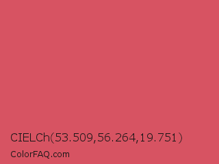 CIELCh 53.509,56.264,19.751 Color is a normal red color and the nearest color is Mandy #e25465. Hex code #d75362 and RGB value is rgb(215,83,98). In RGB color space, this color is composed of 84% red, 33% green, 38% blue, In CMYK color space, this color is composed of 0% cyan, 61% magenta, 54% yellow , 16% black , In HSL color space, this color has a hue angle of 353° , 62% saturation and 58% lightness.