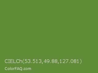 CIELCh 53.513,49.88,127.081 Color is a normal green color and the nearest color is Maximum Green #5e8c31. Hex code #608c37 and RGB value is rgb(96,140,55). In RGB color space, this color is composed of 38% red, 55% green, 22% blue, In CMYK color space, this color is composed of 31% cyan, 0% magenta, 61% yellow , 45% black , In HSL color space, this color has a hue angle of 91° , 44% saturation and 38% lightness.