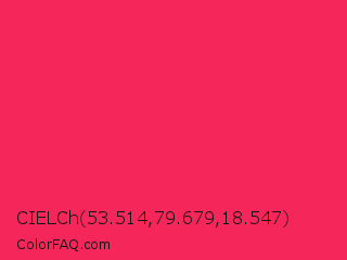CIELCh 53.514,79.679,18.547 Color is a normal red color and the nearest color is Awesome #ff2052. Hex code #f52659 and RGB value is rgb(245,38,89). In RGB color space, this color is composed of 96% red, 15% green, 35% blue, In CMYK color space, this color is composed of 0% cyan, 84% magenta, 64% yellow , 4% black , In HSL color space, this color has a hue angle of 345° , 91% saturation and 55% lightness.