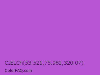 CIELCh 53.521,75.981,320.07 Color is a normal purple color and the nearest color is Medium Orchid #ba55d3. Hex code #b756d5 and RGB value is rgb(183,86,213). In RGB color space, this color is composed of 72% red, 34% green, 84% blue, In CMYK color space, this color is composed of 14% cyan, 60% magenta, 0% yellow , 16% black , In HSL color space, this color has a hue angle of 286° , 60% saturation and 59% lightness.