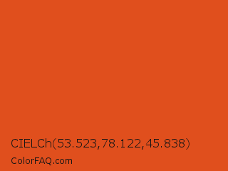 CIELCh 53.523,78.122,45.838 Color is a normal color and the nearest color is Flame #e25822. Hex code #e04f1d and RGB value is rgb(224,79,29). In RGB color space, this color is composed of 88% red, 31% green, 11% blue, In CMYK color space, this color is composed of 0% cyan, 65% magenta, 87% yellow , 12% black , In HSL color space, this color has a hue angle of 15° , 77% saturation and 50% lightness.