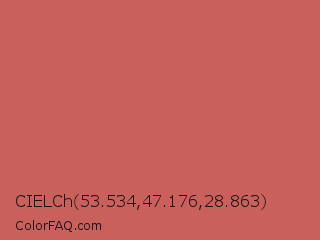 CIELCh 53.534,47.176,28.863 Color is a normal red color and the nearest color is Chestnut Rose #cd5c5c. Hex code #c9605b and RGB value is rgb(201,96,91). In RGB color space, this color is composed of 79% red, 38% green, 36% blue, In CMYK color space, this color is composed of 0% cyan, 52% magenta, 55% yellow , 21% black , In HSL color space, this color has a hue angle of 3° , 50% saturation and 57% lightness.
