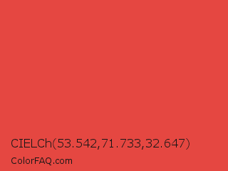CIELCh 53.542,71.733,32.647 Color is a normal red color and the nearest color is Carmine Pink #eb4c42. Hex code #e54741 and RGB value is rgb(229,71,65). In RGB color space, this color is composed of 90% red, 28% green, 25% blue, In CMYK color space, this color is composed of 0% cyan, 69% magenta, 72% yellow , 10% black , In HSL color space, this color has a hue angle of 2° , 76% saturation and 58% lightness.