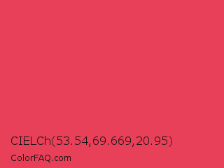 CIELCh 53.54,69.669,20.95 Color is a normal red color and the nearest color is Desire #ea3c53. Hex code #e84059 and RGB value is rgb(232,64,89). In RGB color space, this color is composed of 91% red, 25% green, 35% blue, In CMYK color space, this color is composed of 0% cyan, 72% magenta, 62% yellow , 9% black , In HSL color space, this color has a hue angle of 351° , 79% saturation and 58% lightness.
