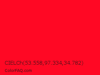 CIELCh 53.558,97.334,34.782 Color is a normal red color and the nearest color is Ruddy #ff0028. Hex code #ff0824 and RGB value is rgb(255,8,36). In RGB color space, this color is composed of 100% red, 3% green, 14% blue, In CMYK color space, this color is composed of 0% cyan, 97% magenta, 86% yellow , 0% black , In HSL color space, this color has a hue angle of 353° , 100% saturation and 52% lightness.