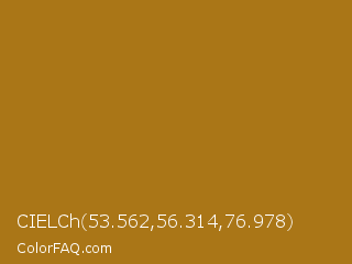 CIELCh 53.562,56.314,76.978 Color is a normal orange color and the nearest color is Mandalay #ad781b. Hex code #aa7617 and RGB value is rgb(170,118,23). In RGB color space, this color is composed of 67% red, 46% green, 9% blue, In CMYK color space, this color is composed of 0% cyan, 31% magenta, 86% yellow , 33% black , In HSL color space, this color has a hue angle of 39° , 76% saturation and 38% lightness.