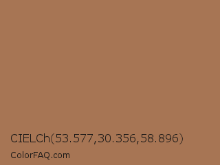 CIELCh 53.577,30.356,58.896 Color is a normal orange color and the nearest color is French Beige #a67b5b. Hex code #a77554 and RGB value is rgb(167,117,84). In RGB color space, this color is composed of 65% red, 46% green, 33% blue, In CMYK color space, this color is composed of 0% cyan, 30% magenta, 50% yellow , 35% black , In HSL color space, this color has a hue angle of 24° , 33% saturation and 49% lightness.