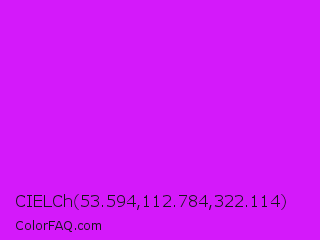 CIELCh 53.594,112.784,322.114 Color is a normal purple color and the nearest color is Vivid Orchid #cc00ff. Hex code #d419fa and RGB value is rgb(212,25,250). In RGB color space, this color is composed of 83% red, 10% green, 98% blue, In CMYK color space, this color is composed of 15% cyan, 90% magenta, 0% yellow , 2% black , In HSL color space, this color has a hue angle of 290° , 96% saturation and 54% lightness.