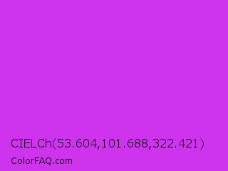 CIELCh 53.604,101.688,322.421 Color is a normal purple color and the nearest color is Steel Pink #cc33cc. Hex code #ce33ed and RGB value is rgb(206,51,237). In RGB color space, this color is composed of 81% red, 20% green, 93% blue, In CMYK color space, this color is composed of 13% cyan, 78% magenta, 0% yellow , 7% black , In HSL color space, this color has a hue angle of 290° , 84% saturation and 56% lightness.