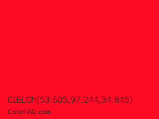 CIELCh 53.605,97.244,34.845 Color is a normal red color and the nearest color is Ruddy #ff0028. Hex code #ff0a24 and RGB value is rgb(255,10,36). In RGB color space, this color is composed of 100% red, 4% green, 14% blue, In CMYK color space, this color is composed of 0% cyan, 96% magenta, 86% yellow , 0% black , In HSL color space, this color has a hue angle of 354° , 100% saturation and 52% lightness.