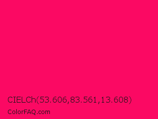 CIELCh 53.606,83.561,13.608 Color is a normal rose color and the nearest color is Vivid Raspberry #ff006c. Hex code #fb0963 and RGB value is rgb(251,9,99). In RGB color space, this color is composed of 98% red, 4% green, 39% blue, In CMYK color space, this color is composed of 0% cyan, 96% magenta, 61% yellow , 2% black , In HSL color space, this color has a hue angle of 338° , 97% saturation and 51% lightness.