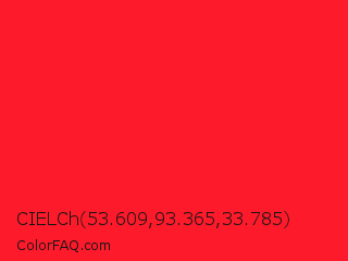 CIELCh 53.609,93.365,33.785 Color is a normal red color and the nearest color is Torch Red #fd0e35. Hex code #fc1a2b and RGB value is rgb(252,26,43). In RGB color space, this color is composed of 99% red, 10% green, 17% blue, In CMYK color space, this color is composed of 0% cyan, 90% magenta, 83% yellow , 1% black , In HSL color space, this color has a hue angle of 355° , 97% saturation and 55% lightness.