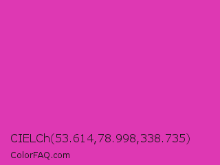CIELCh 53.614,78.998,338.735 Color is a normal magenta color and the nearest color is Frostbite #e936a7. Hex code #de38b3 and RGB value is rgb(222,56,179). In RGB color space, this color is composed of 87% red, 22% green, 70% blue, In CMYK color space, this color is composed of 0% cyan, 75% magenta, 19% yellow , 13% black , In HSL color space, this color has a hue angle of 316° , 72% saturation and 55% lightness.