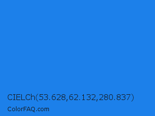 CIELCh 53.628,62.132,280.837 Color is a normal blue color and the nearest color is Blue Crayola #1f75fe. Hex code #1c80ea and RGB value is rgb(28,128,234). In RGB color space, this color is composed of 11% red, 50% green, 92% blue, In CMYK color space, this color is composed of 88% cyan, 45% magenta, 0% yellow , 8% black , In HSL color space, this color has a hue angle of 211° , 83% saturation and 51% lightness.