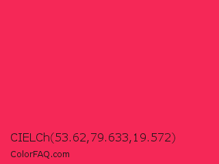 CIELCh 53.62,79.633,19.572 Color is a normal red color and the nearest color is Awesome #ff2052. Hex code #f52857 and RGB value is rgb(245,40,87). In RGB color space, this color is composed of 96% red, 16% green, 34% blue, In CMYK color space, this color is composed of 0% cyan, 84% magenta, 64% yellow , 4% black , In HSL color space, this color has a hue angle of 346° , 91% saturation and 56% lightness.
